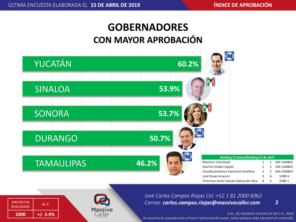 Junto con el Gobernador de Tamaulipas, en la lista aparecen los mandatarios de Yucatán, Mauricio Vila; Sinaloa, Quirino Ordaz y Durango, José Aispuro, que también aparecen como parte de los mejores evaluados en la encuesta de Arias Consultores. La Gobernadora de Sonora, Claudia Pavlovich también ocupa un sitio en la lista de Massive Caller.
