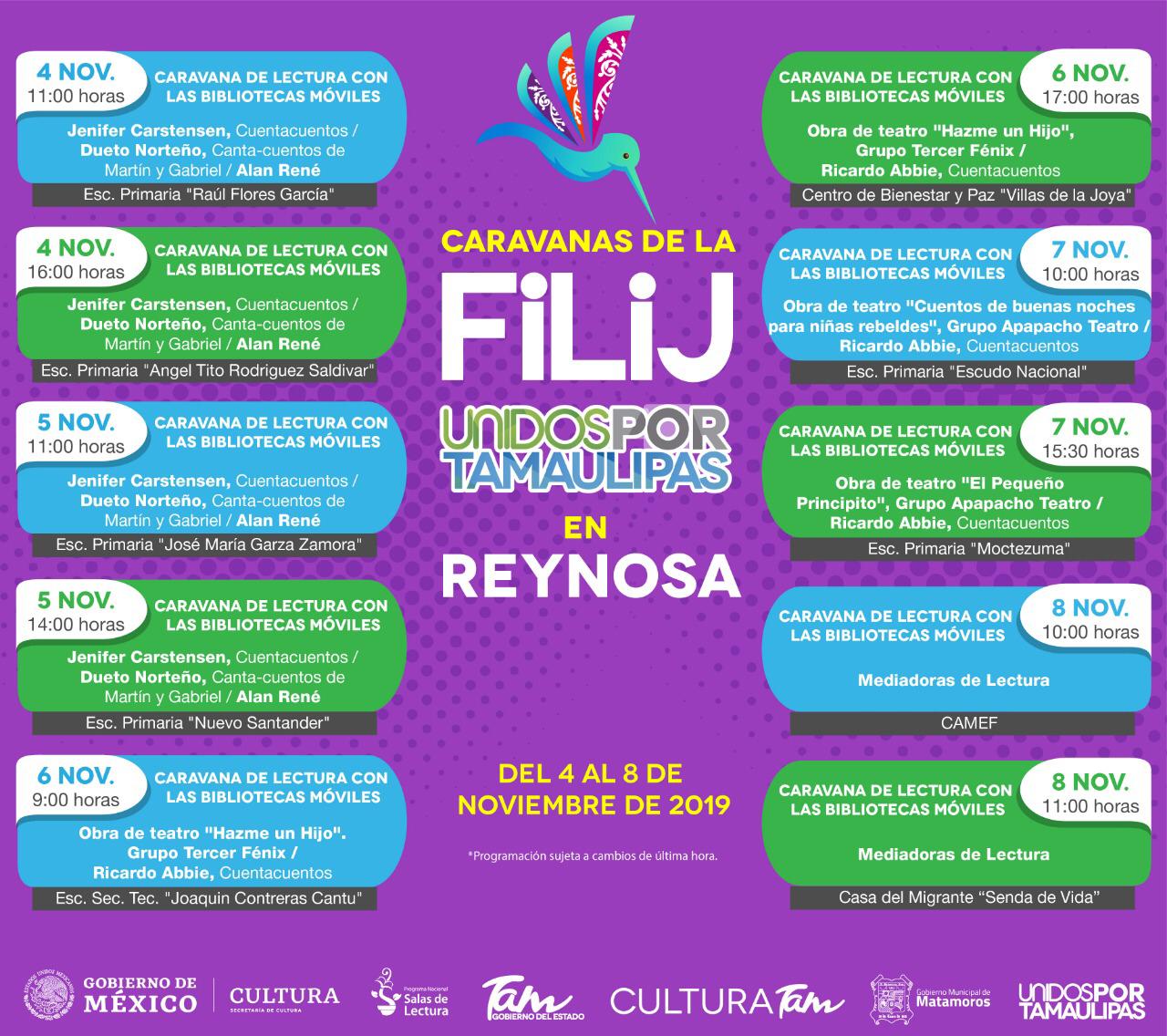 El Gobierno del Estado, a través de Cultura Tamaulipas, en coordinación con la Secretaría de Cultura de gobierno federal, estará llevándose a cabo las caravanas de la Feria Internacional del Libro Infantil y Juvenil Tamaulipas, del 4 al 8 de Noviembre del 2019, en la ciudad de Reynosa.