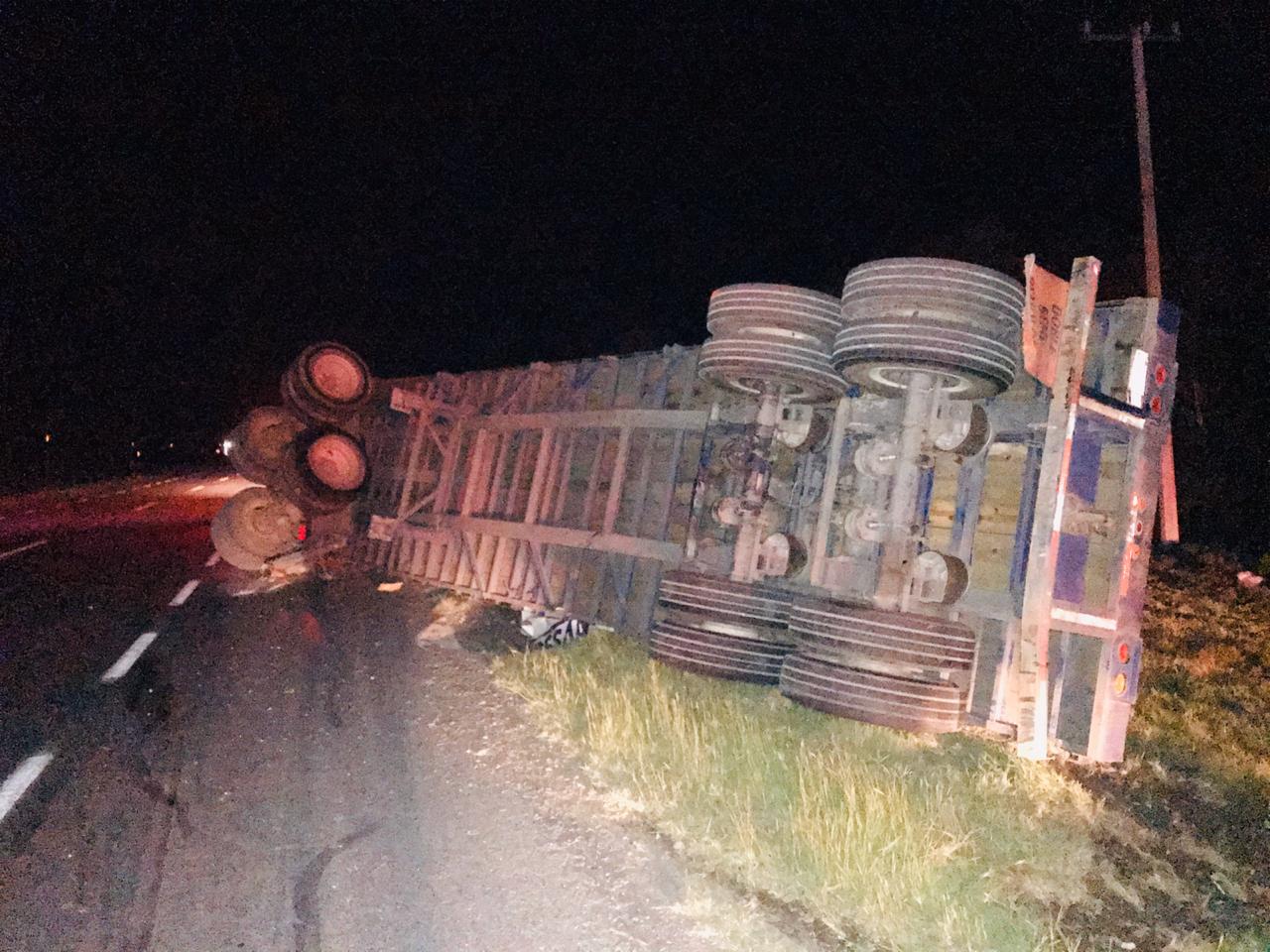 Un contenedor con 24 mil litros de jugo de limón quedó volcado a un costado de la carretera Victoria Monterrey debido a una falla mecánica en el «perico» de un tráiler doble remolque.