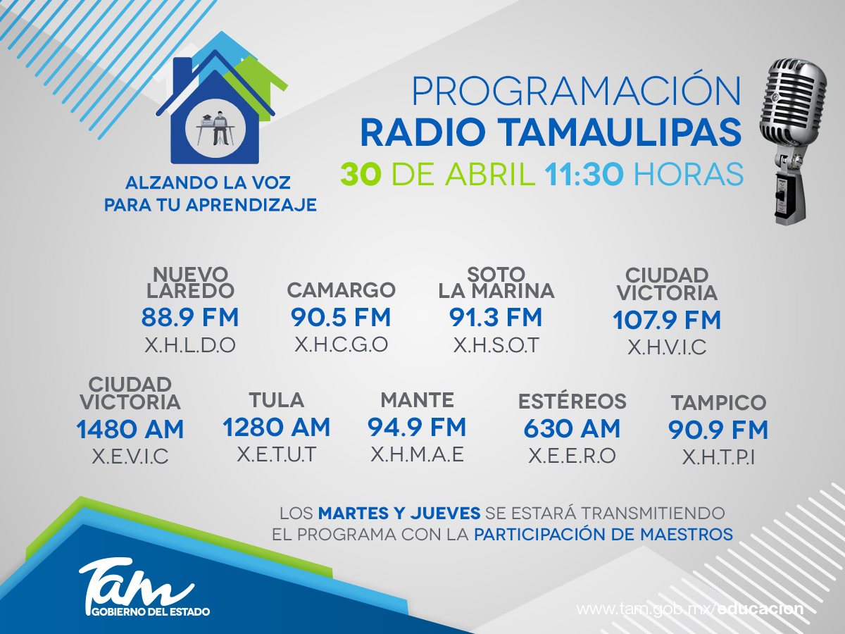 La Secretaría de Educación de Tamaulipas a través de la Subsecretaría de Educación Media Superior y Superior, desarrolla el programa de radio “Alzando la Voz para tu Aprendizaje”, con contenidos basados en los planes y programas de estudio vigentes para atender a los alumnos pertenecientes al Sistema de Telebachillerato Comunitario, además se ofrecen herramientas psicológicas y de convivencia durante el presente aislamiento por la contingencia sanitaria #COVID19 en la entidad.
