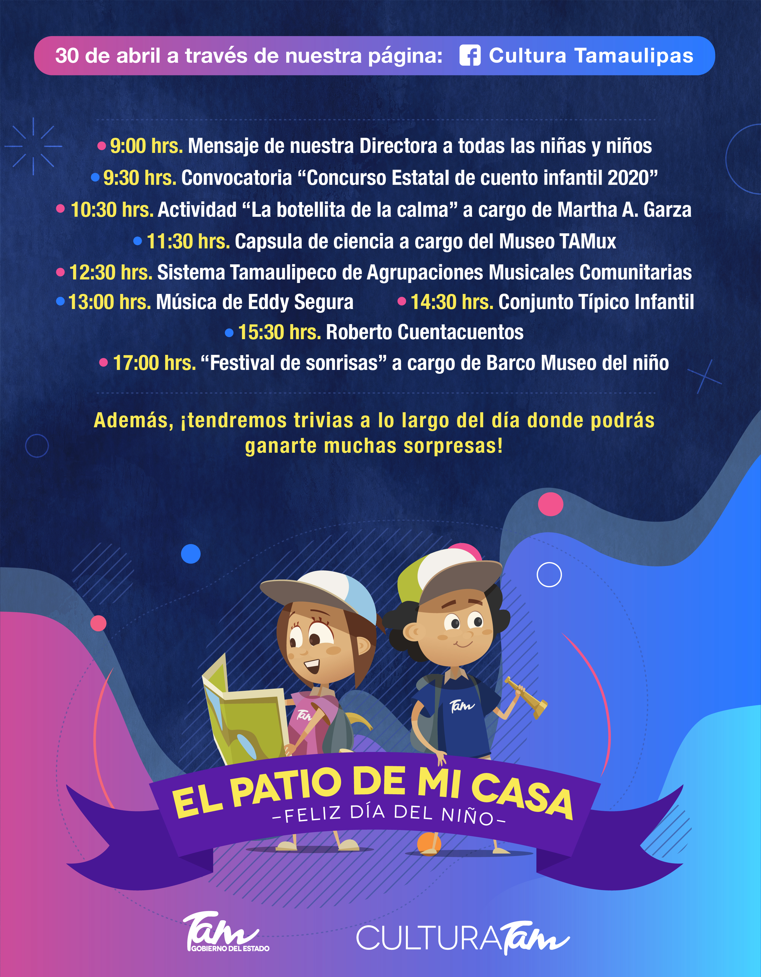 Atendiendo la encomienda del Gobernador, Francisco García Cabeza de Vaca, derivada de la contingencia sanitaria por el COVID-19 y siguiendo las recomendaciones de la Secretaría de Salud de permanecer en casa, la Directora General de Cultura Tamaulipas, Sandra Luz García Guajardo manifestó que se adoptaron vías alternas para que las niñas y los niños tuvieran la oportunidad de disfrutar de videos, convocatorias, cuentacuentos, ciencia, música, danza, regalos y muchas sorpresas más, pensadas especialmente para ellos.