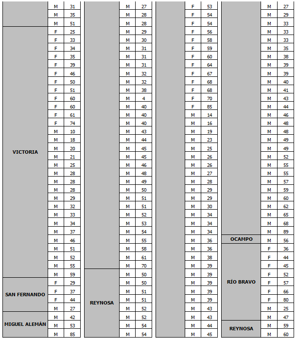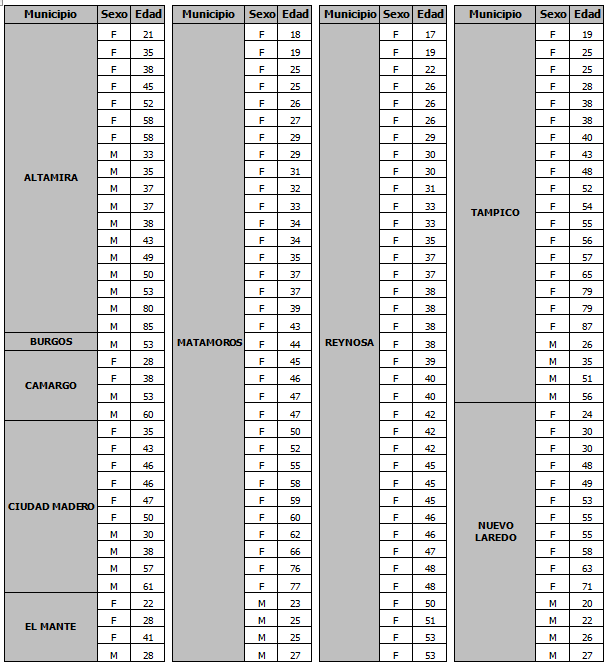 El 23 de junio tres hombres de 41, 54 y 38 años de Reynosa, una mujer de 82 años de Tampico y un hombre de 75 años de Madero; el 24 de junio dos hombres de 54 y 61 años de Reynosa; el 25 de junio un hombre de 51 años y dos mujeres de 64 y 69 años de Reynosa; el 26 de junio una mujer de 63 años y 3 hombres de 50, 30 y 61 años de Reynosa y un hombre de 49 años de Matamoros; y el 27 de junio una mujer de 45 años de Reynosa.