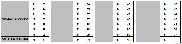 En tanto las defunciones corresponden a los siguientes días: el 16 de junio una mujer de 67 años de Reynosa; el 17 de junio una mujer de 80 años de Reynosa; el 18 de junio una mujer de 67 años de Reynosa; el 19 de junio dos mujeres de 53 y 54 años, y un hombre de 85 años de Reynosa; el 21 de junio una mujer de 48 años de Reynosa y una mujer de 76 años de Río Bravo; el 22 de junio una mujer de 60 años y dos hombres de 43 y 64 años de Reynosa.