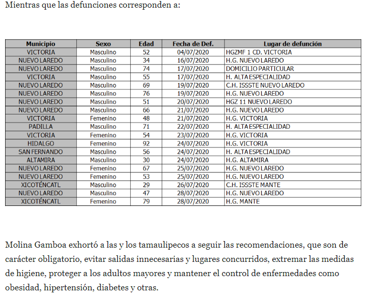 En su actualización sobre la pandemia del nuevo coronavirus en Tamaulipas, la secretaria de Salud, Gloria Molina Gamboa confirmó 359 casos y 19 defunciones por la enfermedad y pidió atender las nuevas disposiciones emitidas por el Gobierno de Tamaulipas para proteger a la población.