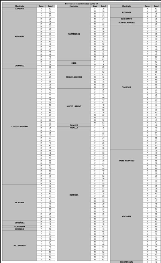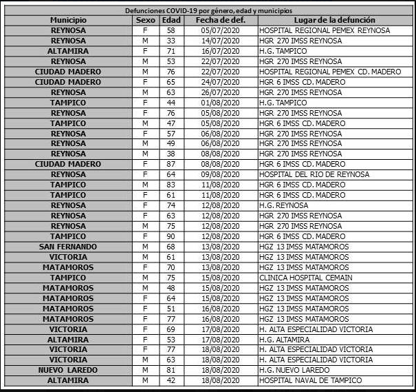 La secretaria de Salud de Tamaulipas, Gloria Molina Gamboa confirmó hoy 301 casos, de los cuales 69 corresponden al día 17 de agosto y el resto al 18, y 35 nuevas defunciones por el virus SARS-COV2.