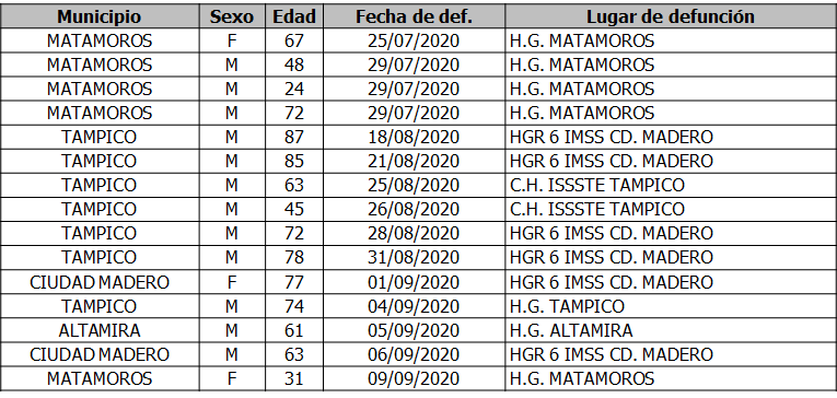 Al corte del 10 de septiembre, la secretaria de Salud de Tamaulipas, Gloria Molina Gamboa confirmó 209 nuevos casos de COVID-19 y 15 fallecimientos, por lo que pidió a la población continuar con las medidas preventivas requeridas en la nueva realidad.