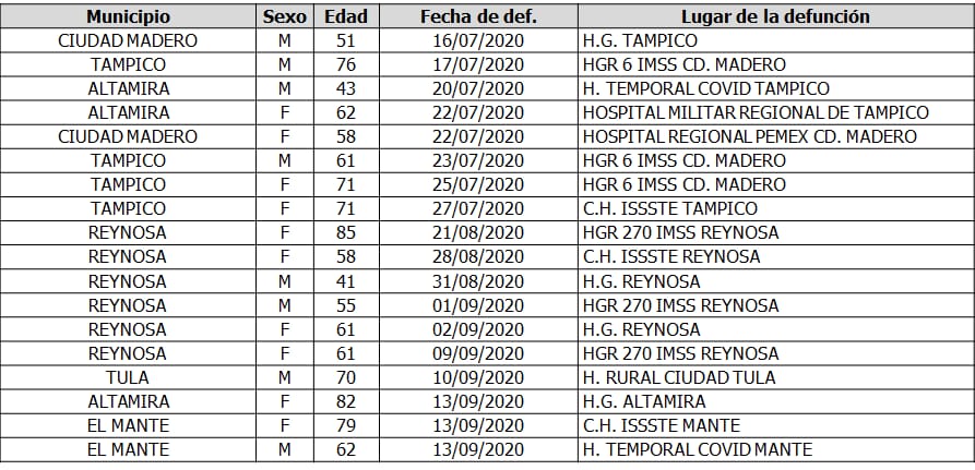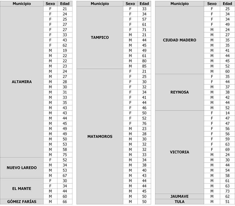 CIUDAD VICTORIA, Tamaulipas.- Tamaulipas registró durante las últimas horas, 114 casos del nuevo coronavirus y sumó 18 nuevos fallecimientos, informó la secretaria de Salud, Gloria Molina Gamboa.