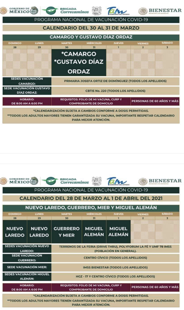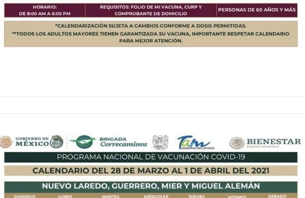 A partir de mañana domingo 28 de marzo se estará aplicando a personas de 60 años y más la vacuna contra covid-19 en los municipios de Nuevo Laredo, Guerrero, Mier y Miguel Alemán.