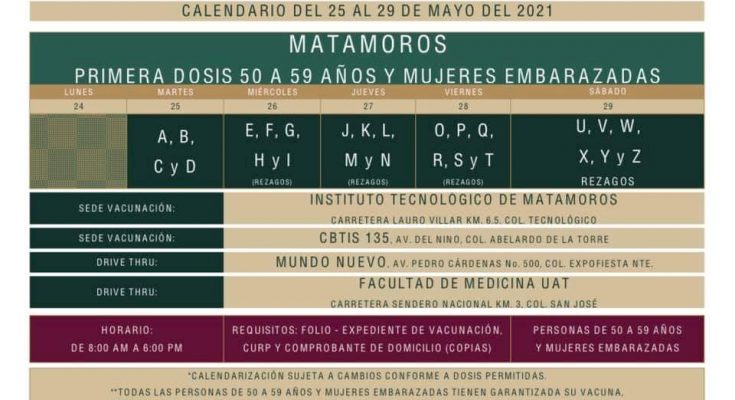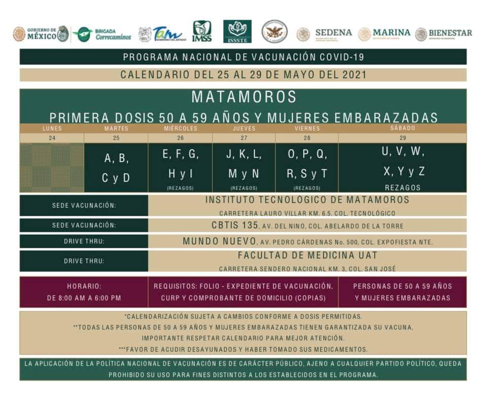 Al anunciar lo anterior, el delegado estatal de Programas para el Desarrollo en Tamaulipas José Ramón Gómez Leal, a través de una publicación en su cuenta personal de redes sociales, detalló que la vacunación para personas de 50 a 59 años y mujeres embarazadas se llevará a cabo del martes 25 de mayo al sábado 29 de mayo con un horario de 8:00 de la mañana a 6:00 de la tarde.
