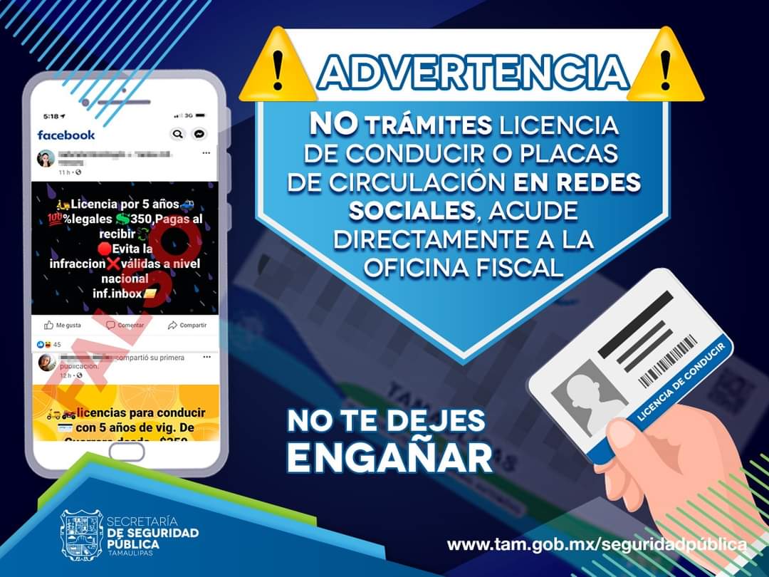 La SSP de Tamaulipas exhortó a la ciudadanía a hacer caso omiso de dichas publicaciones y acudir directamente a las oficinas fiscales de cada municipio para tramitar su licencia, ya que podría ser una estafa.