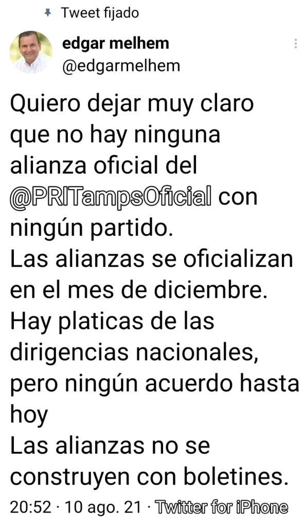 Cabe señalar que desde el día de ayer el dirigente priista en Tamaulipas publicó en redes sociales; «quiero dejar muy claro que no hay ninguna alianza oficial del PRI Tamaulipas con ningún partido. Las alianzas se oficializan en el mes de diciembre. Hay pláticas de las dirigencias nacionales pero ningún acuerdo hasta hoy».