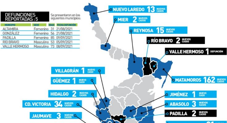 Tamaulipas cerró la jornada de hoy con 397 nuevos pacientes confirmados a COVID-19 y 5 fallecimientos por la enfermedad, informó desde esta ciudad capital la secretaria de Salud, Gloria Molina Gamboa al presentar el estado oficial de la pandemia.