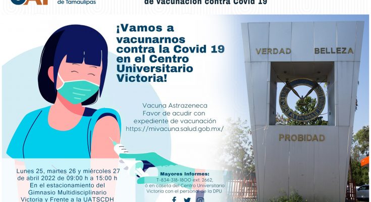 Durante los días del 25 al 27 de abril estarán disponibles los módulos de vacunación para que la comunidad universitaria de la capital tamaulipeca asista a aplicarse la vacuna AstraZeneca, primera, segunda dosis y refuerzo, contra la COVID-19.