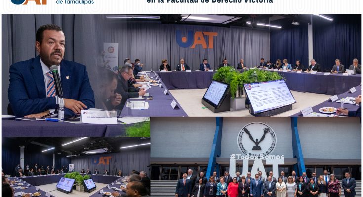 Durante la reunión celebrada en la Facultad de Derecho del Campus Victoria, el Rector estuvo acompañado del Dr. Eduardo Arvizu Sánchez, Secretario General de la UAT; la Dra. Rosa Issel Acosta González, Secretaria Académica, y el Dr. Armando Villanueva Mendoza, Director anfitrión.