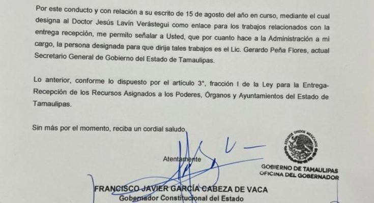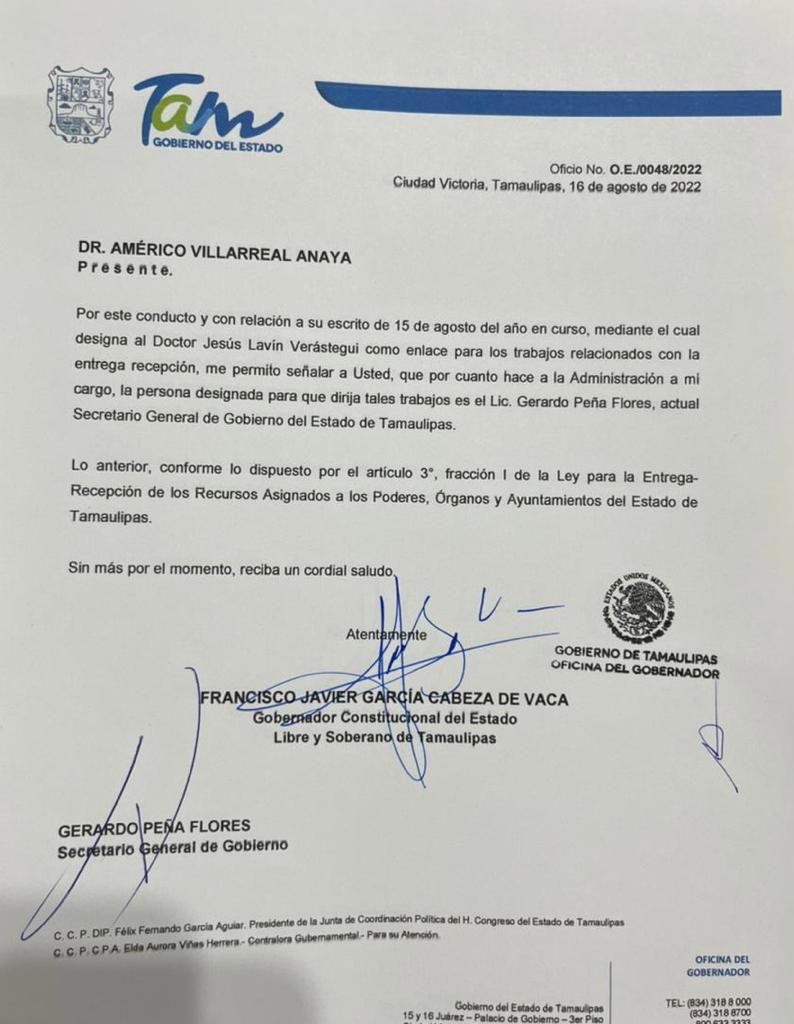 El oficio No. O.E./0048/2022 firmado por el Gobernador saliente Francisco García Cabeza de Vaca es en respuesta a un documento entregado en la víspera por el gobernador electo en el que dió a conocer que el Dr. Jesús Lavín Verástegui será su Enlace para el proceso de entrega-recepción que iniciará el 01 de septiembre.