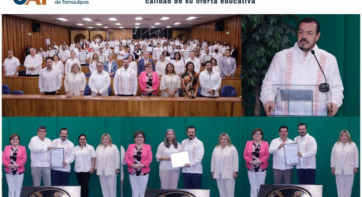 El C. P. Guillermo Mendoza Cavazos, rector de la Universidad Autónoma de Tamaulipas (UAT), entregó reconocimientos a treinta programas educativos que fueron evaluados y acreditados, del año 2021 a la fecha, por organismos nacionales, reconocidos ante la Secretaría de Educación Pública (SEP).