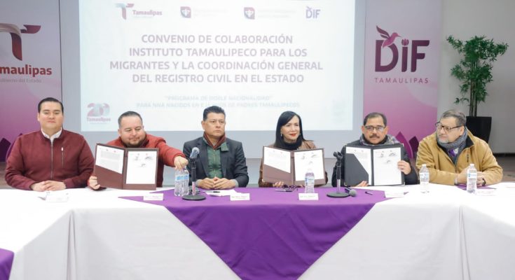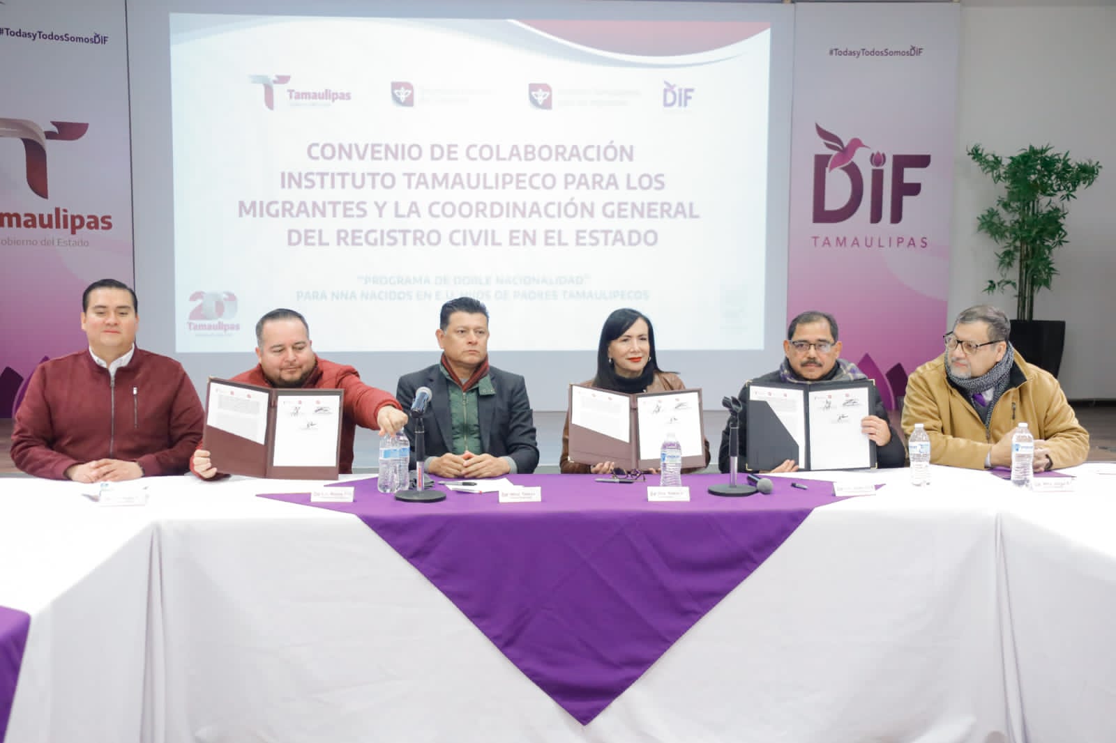 Ciudad Victoria, Tamaulipas. Con la finalidad de recobrar la identidad de las niñas, niños y adolescentes hijos de tamaulipecos y nacidos en los Estados Unidos, firmaron un convenio de colaboración el Instituto Tamaulipeco para los Migrantes y la Coordinación del Registro Civil, teniendo como testigo al Sistema DIF Tamaulipas que preside la doctora María de Villarreal.