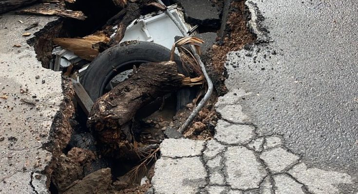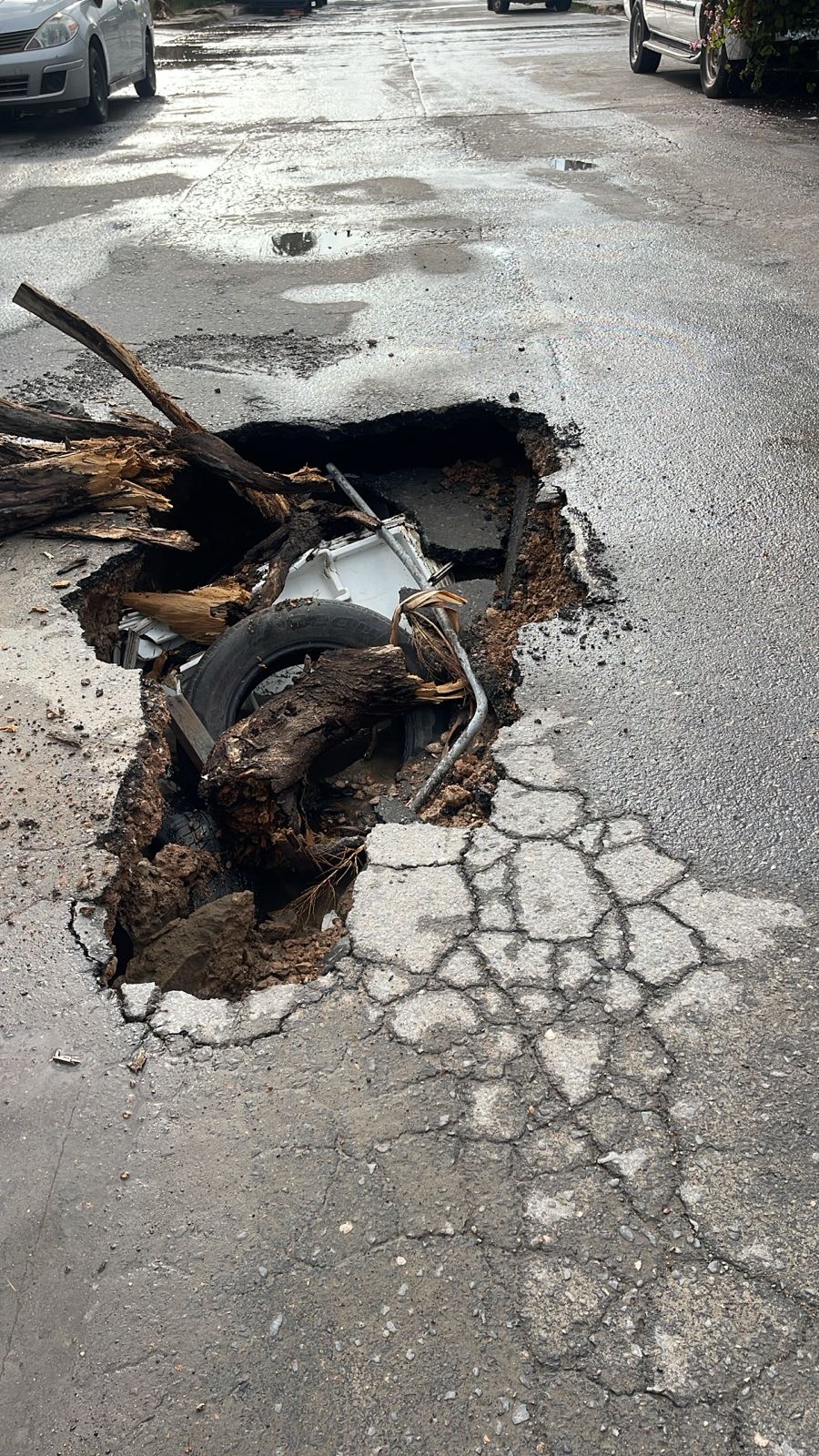 “El hundimiento no era tan grande empezó como con un agujero la semana antepasada, luego se hizo más grande, como de un metro de ancho y ahora mide más de dos metros y en lo profundo era mucho más pero la gente le ha ido apuntando sillas, llantas, de todo porque tienen miedo que este se haga más grande, y como no, nuestras casas se pueden ver afectadas”, dijo Alondra Gamboa, quien vive justo frente a este hundimiento, mismo que han reportado a la Comisión Municipal de Agua Potable y Alcantarillado (Comapa) y al Siga, en donde solo les dicen que ya tienen el reporte.