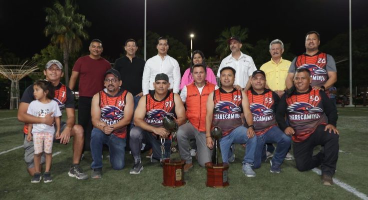 Ciudad Victoria, Tamaulipas.- El director general del Instituto del Deporte, Manuel Virués Lozano, encabezó la ceremonia de premiación a las y los campeones de la primera temporada del torneo de tochito flag, celebrado en Ciudad Victoria.