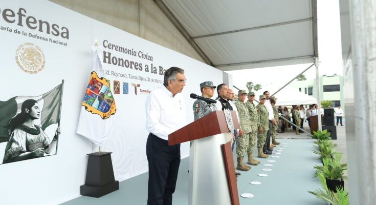 Al encabezar ceremonia de honores a la bandera en Reynosa, el gobernador reconoció la respuesta institucional y comunitaria con el fin de proteger vidas y poner a salvo a la población en riesgo.