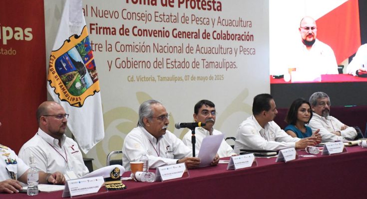 Ciudad Victoria, Tamaulipas.- Con el objetivo de promover la coordinación y colaboración entre los tres niveles de gobierno, así como con los organismos productivos del sector social y privado, se realizó la instalación del Consejo Estatal de Pesca y Acuacultura, acompañada de la firma del Convenio General de Colaboración entre la Comisión Nacional de Acuacultura y Pesca y el Gobierno de Tamaulipas.