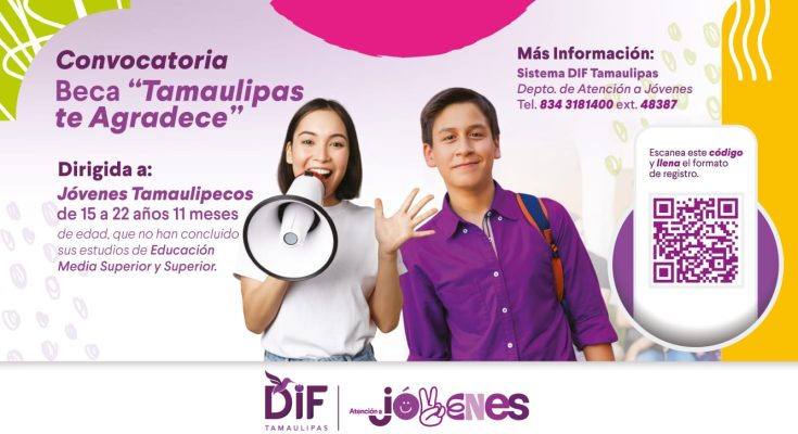 Ciudad Victoria, Tamaulipas.- El Sistema para el Desarrollo Integral de la Familia de Tamaulipas, presidido por la doctora María de Villarreal, a través de la Dirección de Fortalecimiento Familiar, invita a la juventud tamaulipeca a participar en la convocatoria de la beca “Tamaulipas te agradece”.