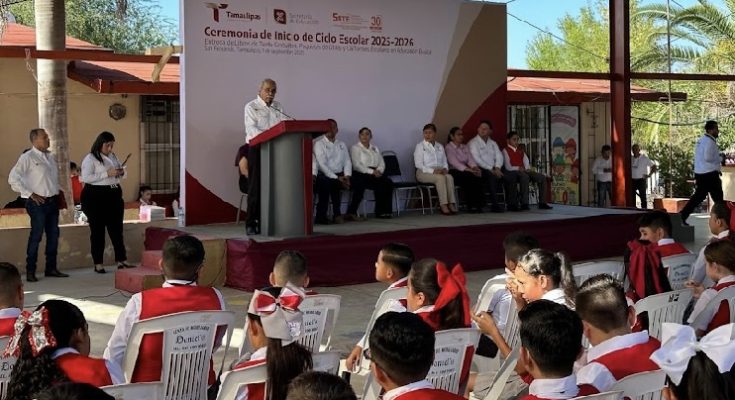San Fernando, Tamaulipas.- En representación del gobernador Américo Villarreal Anaya, el Secretario de Desarrollo Rural, Pesca y Acuacultura, Antonio Varela Flores, puso en marcha las actividades del ciclo escolar 2025-2026 en la escuela Primaria Antonio Beltrán Gracia, ubicada en el municipio de San Fernando.