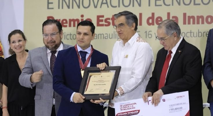El gobernador Américo Villarreal Anaya hizo entrega de la Medalla “Ramiro Iglesias Leal” al ganador del Premio Estatal de la Innovación, la Ciencia y la Tecnología 2025 en la categoría de Innovación, el Dr. Edgar Tello Leal de la Facultad de Ingeniería y Ciencias de la Universidad Autónoma de Tamaulipas; de la Medalla “Ruy Pérez Tamayo”, al ganador en la categoría de Ciencia, el Dr. Gaspar Manuel Parra Bracamonte del Centro de Biotecnología Genómica del Instituto Politécnico Nacional, y en la categoría de Tecnología, la Medalla “María de los Ángeles Valdés Ramírez”, al Dr. Noé Toledo González de la Universidad Tecnológica de Matamoros.