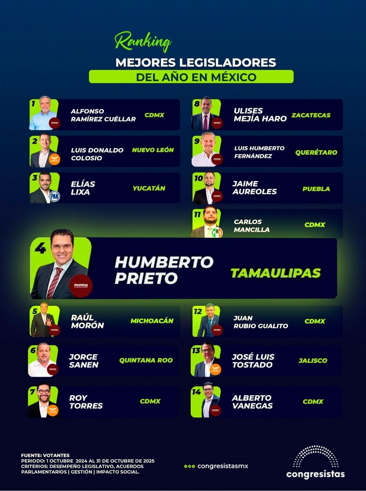 Compitiendo dentro de las primeras 5 posiciones, con senadores y diputados federales, Prieto Herrera es el único diputado local dentro de los mejores calificados por el ranking 2025.