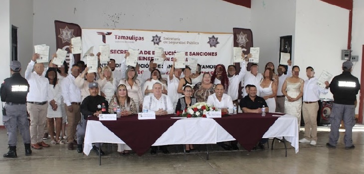 Matamoros, Tamaulipas.- En un ambiente de respeto y compromiso, 15 hombres y tres mujeres que residen en el Centro de Ejecución de Sanciones (CEDES) del municipio de Matamoros formalizaron su unión a través de la Campaña de Matrimonios Colectivos 2025 organizada por el Sistema DIF.