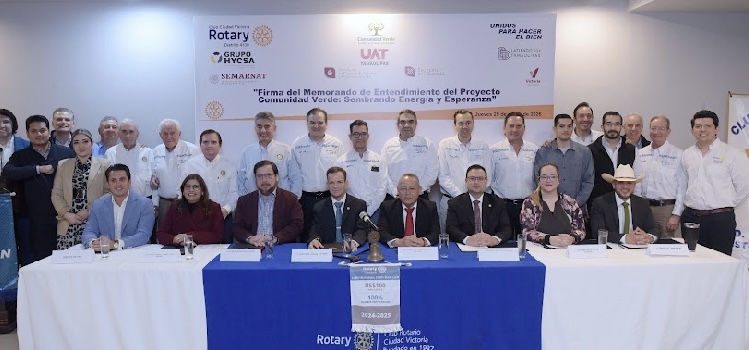 En ese marco, se llevó a cabo la firma del convenio de colaboración del proyecto Comunidad Verde, una alianza estratégica encabezada por el Club Rotary Ciudad Victoria, junto con la Secretaría de Desarrollo Urbano y Medio Ambiente (SEDUMA), la Secretaría de Educación de Tamaulipas (SET), la Universidad Autónoma de Tamaulipas (UAT), la SEMARNAT, el Gobierno municipal de Victoria, la asociación civil Latiendo por Tamaulipas y el Grupo HYCSA.