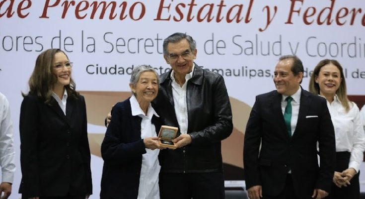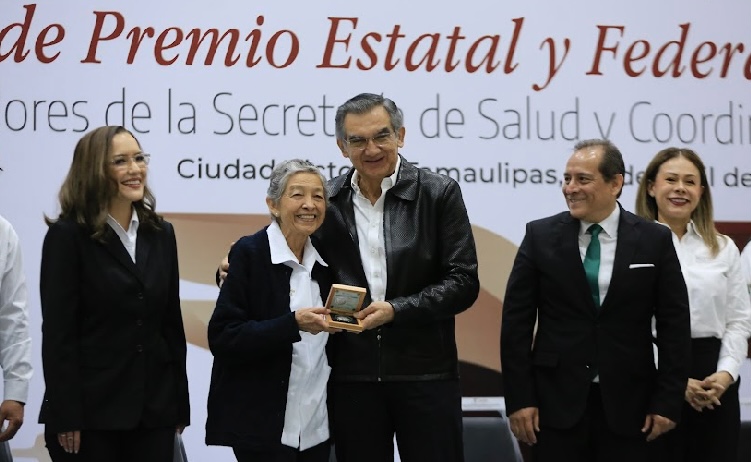 Acompañado por Marggid Rodríguez Avendaño, coordinador de IMSS-Bienestar en Tamaulipas y dirigentes sindicales, el jefe del Ejecutivo entregó 37 premios de antigüedad, de un total de 1,400 a personal de salud, destacando por 60 años de servicio, Almarcelia Cárdenas Guardado, enfermera general titulada «B», del Distrito de Salud para el Bienestar I, en Ciudad Victoria.