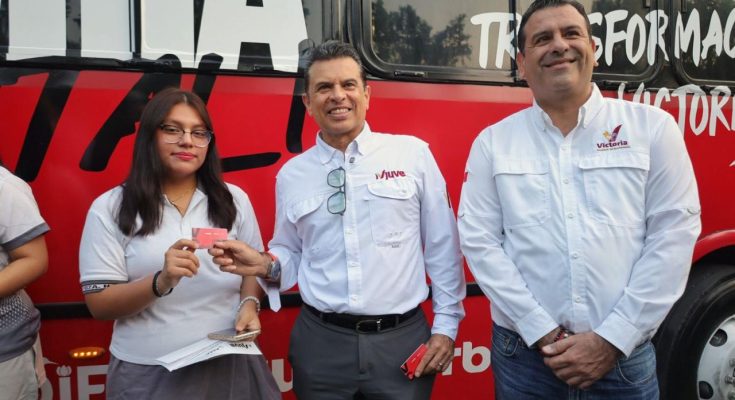 En punto de las 6 am, arribó en compañía del Jefe del Departamento de Participación de la Juventud Benjamín Martínez Ramos y el vocero de Jóvenes de Victoria Abraham Gattás Rodríguez, a la parada oficial de la unidad para hacer entrega de la tarjeta digital a los alumnos beneficiados.