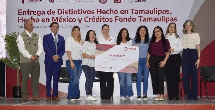 Nuevo Laredo, Tamaulipas.– Con el propósito de fortalecer el desarrollo de las micro, pequeñas y medianas empresas en la región, la secretaria de Economía, Ninfa Cantú Deándar, encabezó la entrega de distintivos “Hecho en Tamaulipas” y “Hecho en México”, así como de créditos del Fondo Tamaulipas, en un evento que reunió a líderes empresariales y representantes de instituciones de educación superior del municipio.